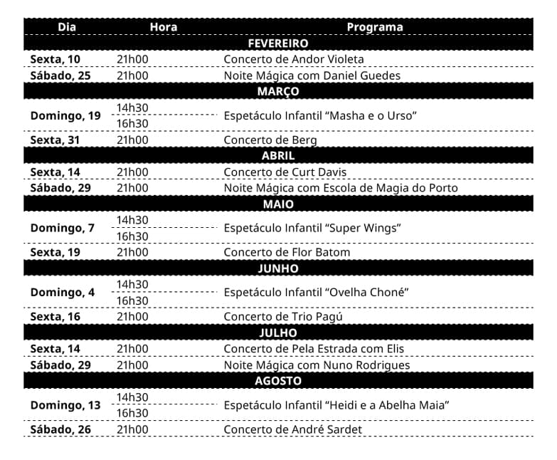Programa inclui concertos de Berg e André Sardet, noites mágicas com Daniel Guedes e Nuno Rodrigues, e espetáculos infantis como “Masha e o Urso”, “Super Wings”, “Ovelha Choné” ou “Heidi e a Abelha Maia”